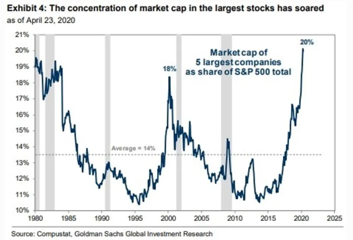 Other reasons for the rebound could be that big firms are healthy enough to survive and possibly thrive in the aftermath. At the same time, the largest five holdings make up a greater percentage of the S&P 500 than during the top of the tech bubble.