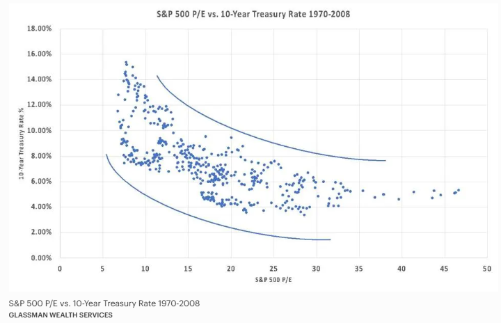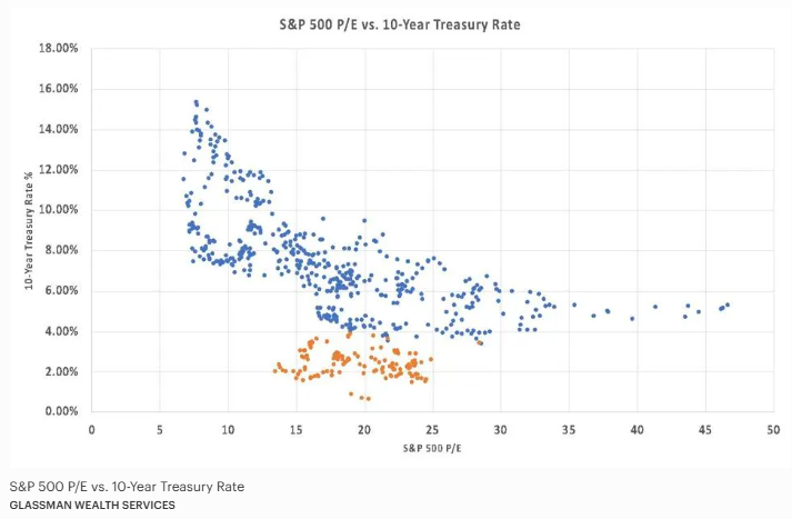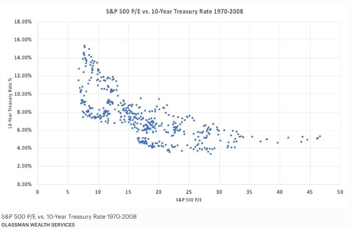 The graph below plots historical P/E ratios for the S&P 500 in different rate environments from January 1970 through May 1st of this year. Each point depicts where the S&P 500’s P/E ratio was in relation to the 10-year treasury interest rate at that time.